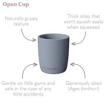 We designed our own Open Cup as we found the cups already available were too small for toddlers or way to flexible, so that they squished easily when being picked up, resulting in spills. Our open cups are generously sized with a capacity of up to 250ml, have a naturally grippy texture and are virtually unbreakable. We have worked closely with the manufacturer to find the most suitable stiffness for the silicone to ensure the perfect balance between being soft for safety reasons yet sturdy to practically function. These are the perfect safe cup, particularly for use on hard floors or outdoors (great for camping or summer BBQ’s).